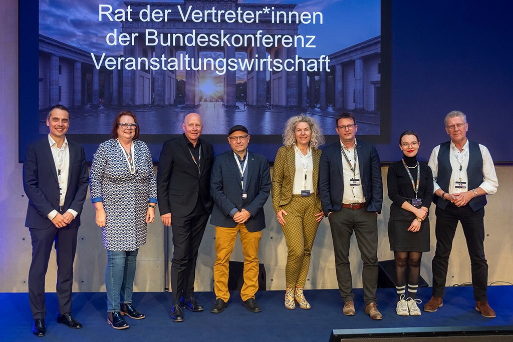 Rat der Vertreter:innen der Bundeskonferenz Veranstaltungswirtschaft (v.l.n.r.): Christian Eichenberger, Martina Fritz, Mike P. Heisel, Marcel Fery, Kerstin Meisner, Alexander Ostermeier, Rike van Kleef, David Eickelberg (Bild: Sebastian Greuner)