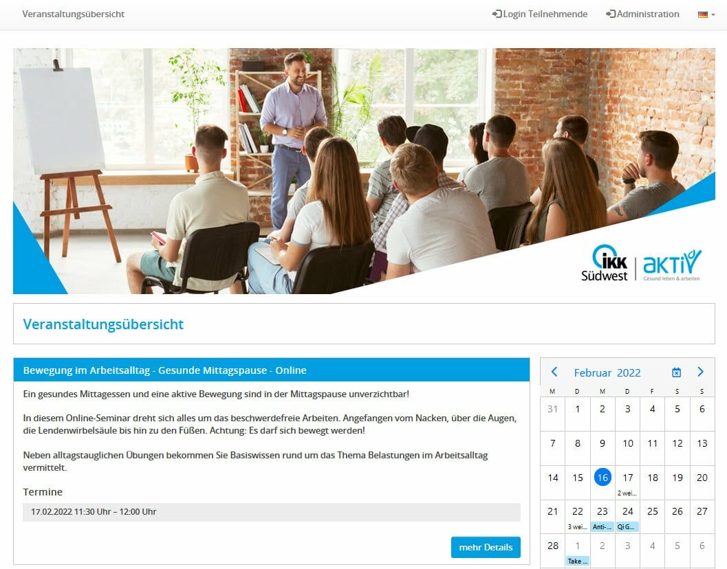 Die regionale Krankenkasse bietet in ihrem Gesundheitsportal digitale Veranstaltungen zur Prävention und Gesundheitsförderung an. Über die Webseite IKK Aktiv gelangen Interessierte zu einer speziell an die Bedürfnisse der IKK Südwest angepassten Version von moreEvent. In der Veranstaltungsübersicht wird das Angebot mit allen verfügbaren Terminen veröffentlicht. Die Inhalte sowie das Layout im CI der IKK Südwest werden über das integrierte Content-Management-System (CMS) eigenständig eingepflegt und gestaltet. Interessierte können sich über die Inhalte informieren und anschließend direkt zum gewünschten Veranstaltungstermin online anmelden.