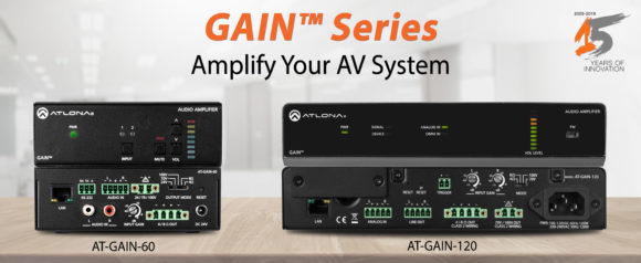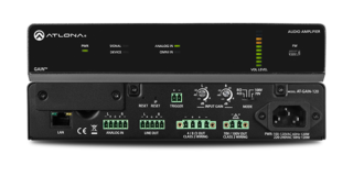 Die GAIN ™ -Serie von Atlona ist Class D effizient und für 4/8 Ohm- und 70/100 Volt-Anwendungen ausgelegt. Sowohl der AT-GAIN-60 als auch der AT-GAIN-120 sind konvektionsgekühlt, unterstützen die RS232- und Ethernet-Steuerung und bieten mehrere Eingangsanschlüsse für eine einfache Installation.