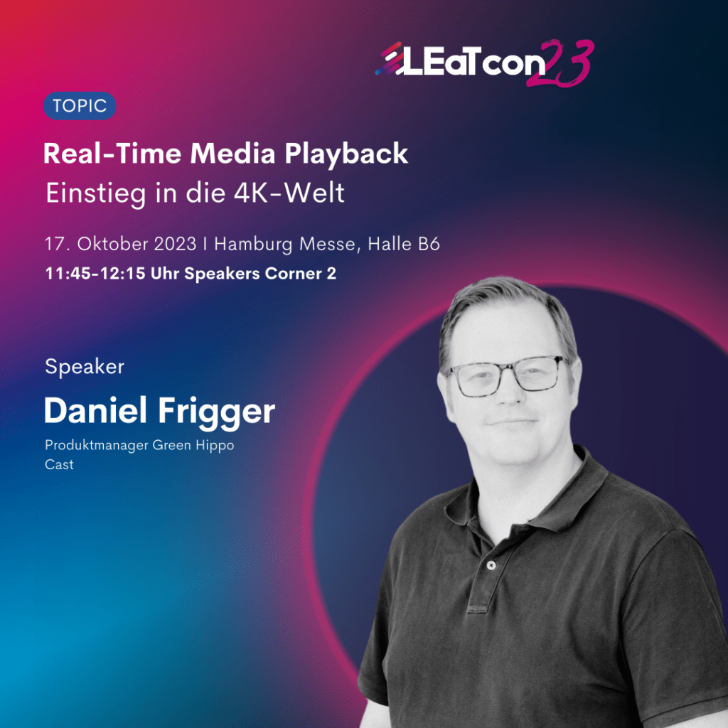 Am 17. Oktober kannst du dich auf der LEaT con 2023 auf einen zukunftsweisenden Vortrag freuen: „Real-Time Media Playback – Einstieg in die 4K-Welt“, präsentiert von Daniel Frigger, Green Hippo Produktmanager bei Cast.