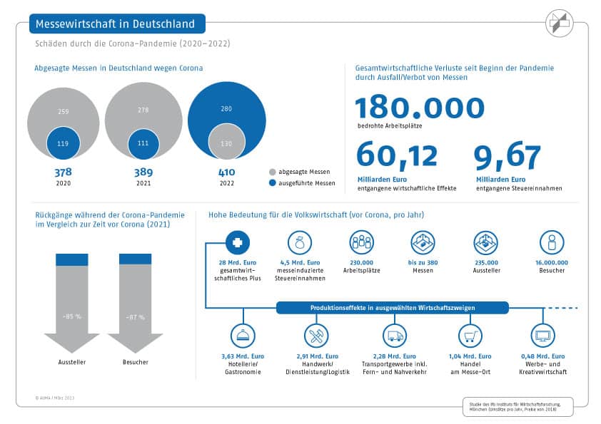 Der Verband der deutschen Messewirtschaft AUMA stellt fest, dass die Corona-Pandemie und die damit verbundenen Messeverbote tiefe Spuren in der deutschen Messewirtschaft hinterlassen haben: fast 670 gestrichene Messen seit März 2020, bis zu 87% weniger ausstellende Unternehmen und Besucher:innen auf den wenigen veranstalteten Messen zwischen den Lockdowns sowie mehr als 60 Milliarden Euro gesamtwirtschaftliches Minus und rund zehn Milliarden Euro weniger Steuereinnahmen.