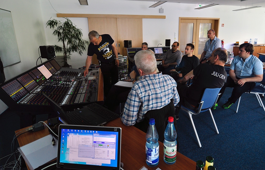 An den ersten zwei Tagen lernen die Teilnehmer die Grundlagen für die Bedienung der Mischpulte und der Nexus-Audiokreuzschiene von Stage Tec kennen. Am dritten Tag erfolgt ein Training für Fortgeschrittene.