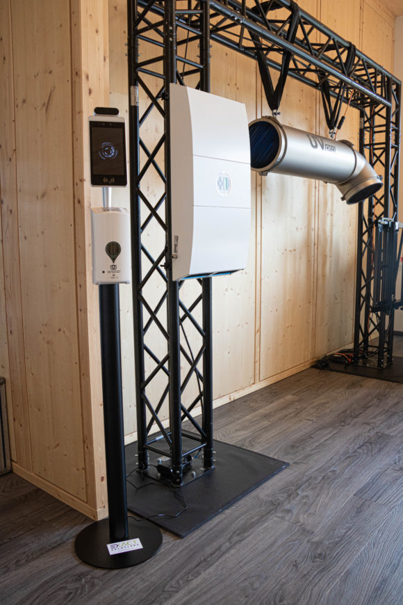 Desinfektionsmittel-Stelen mit Temperaturmessung und Mund-Nasen-Bedeckungs-Erkennung sowie Luftreiniger mit UV-Technik waren nicht nur Teil der Ausstellung bei Exact-Solutions, sondern wurden auch in den Ausstellungsräumen eingesetzt. (Bild: Lang AG)