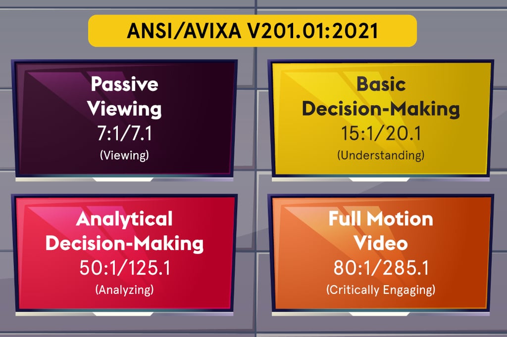 Die vier Kontrastverhältnisse der Norm basieren nach AVIXA auf den folgenden Anforderungen an die Betrachtung von Inhalten: