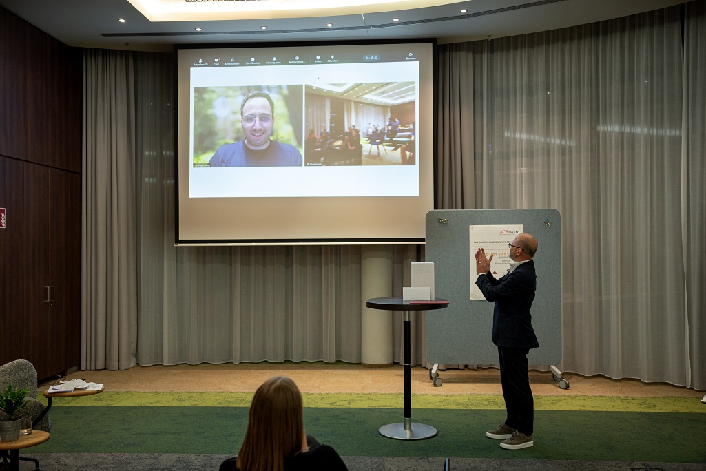Der Gewinner der besten Masterarbeit Peter Hosp präsentierte die Ergebnisse seiner Arbeit per Video und wurde zur Verleihung live zugeschalten. (Bild: Thomas Grundschober / Austrian Convention Bureau)