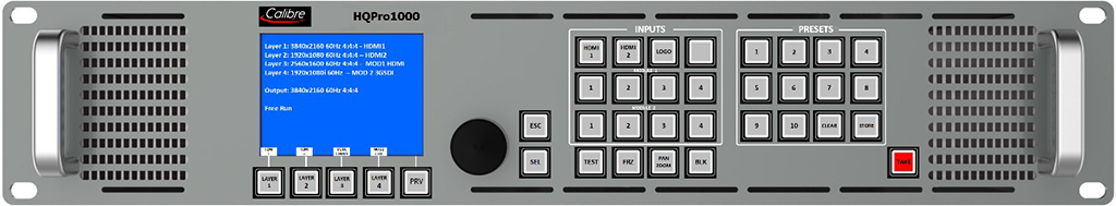 Der HQPro1000 erblickt bei der Prolight+Sound zum ersten Mal das Licht der Öffentlichkeit. Der HQPro1000 ist das erste Produkt aus Calibres neuer HQPro-Serie mit hochqualitativen 4K-Skalierern und -Umschaltern, das sich durch modularen Aufbau und somit optimale Aufrüstungsmöglichkeiten, komplett übergangsfreies Umschalten sowie Unterstützung mehrerer Quellen und Ebenen auszeichnet. Die Skalierung übernimmt Calibres branchenführende, firmeneigene HQUltra-Technologie, die extrem geringe Latenzzeiten bietet und mit den RGB-Formaten 4K50/60 4:4:4 arbeitet.