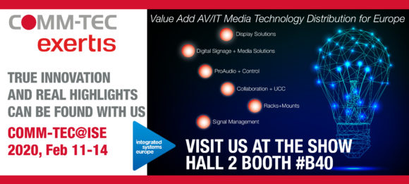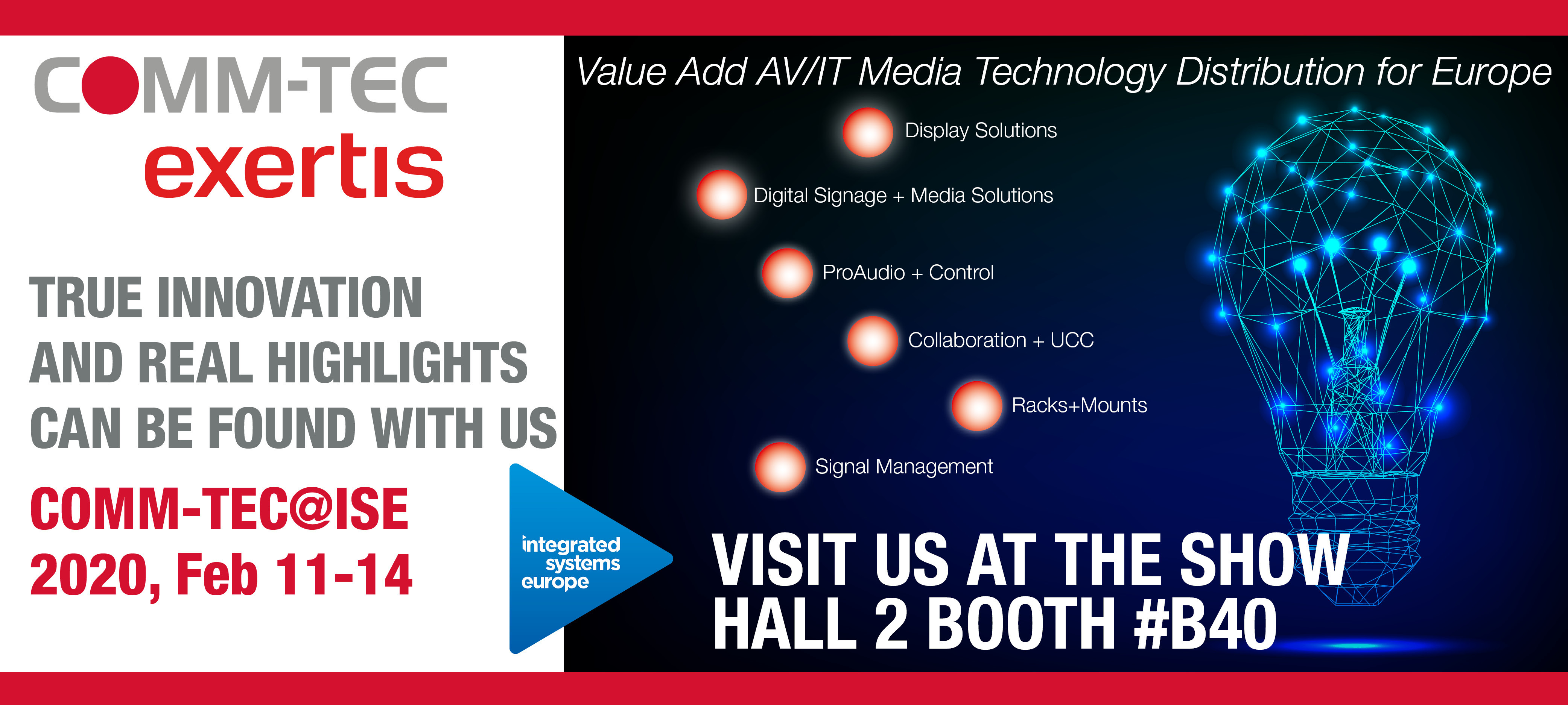 In wenigen Wochen ist es soweit: Die Integrated Systems Europe 2020 öffnet am 11. Februar 2020 Ihre Pforten in Amsterdam. Auch 2020 präsentiert Comm-Tec auf der ISE seinen Fachbesuchern wieder Highlights, Trends, Produkte und Lösungen aus der AV und IT-Medientechnik – Technik zum Erleben und Anfassen! Mit einem modifizierten Standkonzept konzentriert sich Comm-Tec auf Highlights aus den Bereichen Display Solutions, Digital Signage und Media Solutions, Pro Audio, Collaboration und UCC, Racks und Mounts sowie Signalmanagement, die anwenderorientiert gezielt in Szene gesetzt werden.