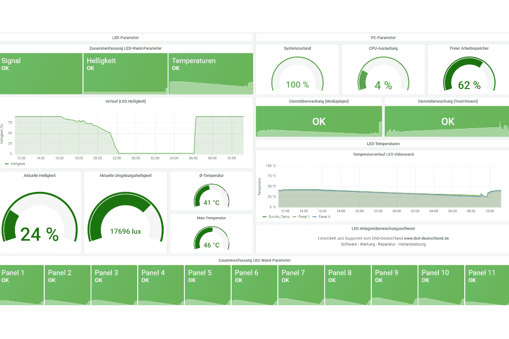 Die „DOOH-Boxx“ von 99sensors liest über eine COM-Port-Verbindung technische Daten aus Digital-Signage-Displays aus und generiert bei Bedarf Alerts für die Verantwortlichen, etwa wenn Panels ausfallen, die Temperatur zu hoch ist oder die Display-Helligkeit nicht passt. Verantwortliche können automatisiert und aus der Ferne Aktionen veranlassen, beispielsweise Display-Helligkeiten in Abhängigkeit der Umgebungshelligkeit regeln oder Helligkeiten verringern, wenn keine Personen über einen Sensor gemeldet werden. DSD Deutschland bietet mit „DisplayControl“ eine ähnliche Kompetenz für LED-Wände an, wobei die Software von DSD die Daten aus den LED-Panels ausliest. Auch hier können Verantwortliche Management-Aktionen aus der Ferne starten.