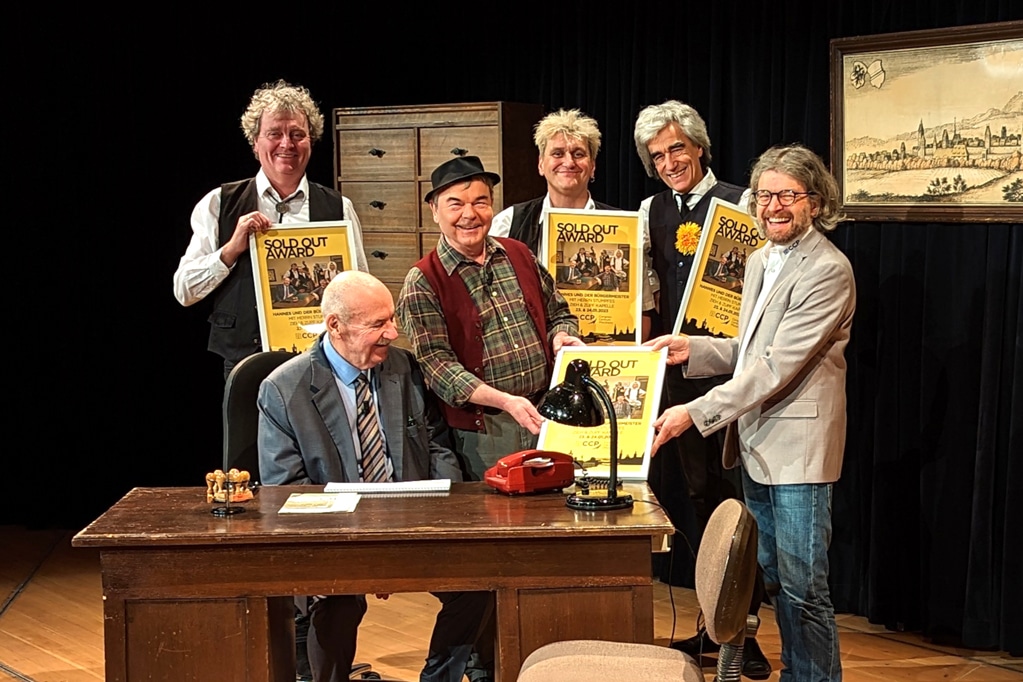 Um Besucher:innen Künstler:innen und Veranstalter:innen zu zeigen, das im CCP wieder alles möglich sei, wurde jetzt erstmals der Sold Out Award verliehen. Vertriebsleiter Daniel Schuch überreichte die Auszeichnung an den Bürgermeister Karlheinz Hartmann und seinen Amtsboten Hannes (Albin Braig), die bereits zum 13. Mal im CongressCentrum Pforzheim gastierten. Im Jahre 1997 waren die beiden aus dem SWR-Fernsehen bekannten Mundartkomiker zum ersten Mal in der damals gerade einmal zehn Jahre alten Stadthalle, die wenige Jahre später zum CongressCentrum Pforzheim vergrößert wurde.