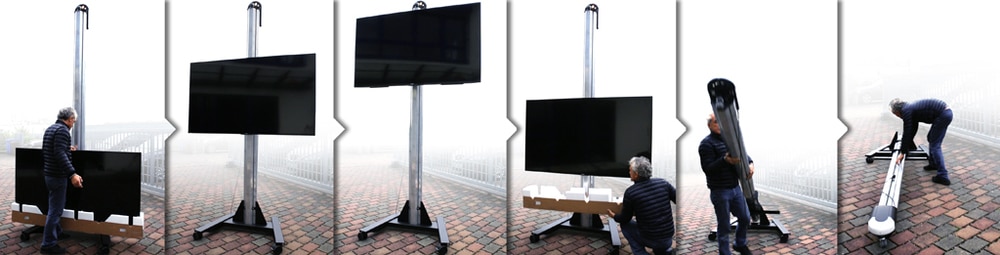 Ebenfalls dabei: das One Man Wonder. Das MAGIC Profi l eignet sich hervorragend als elektrisch motorisches Gestell. Es genügt ein Mann, um große und schwere Displays an das Profi l zu montieren. Innerhalb kürzester Zeit kann man so alleine ein Display elektromotorisch auf- und abbauen. Das motorische Gestell ist klapp- und rollbar, dadurch wird ein einfacher Transport auch durch Türöffnungen ermöglicht.