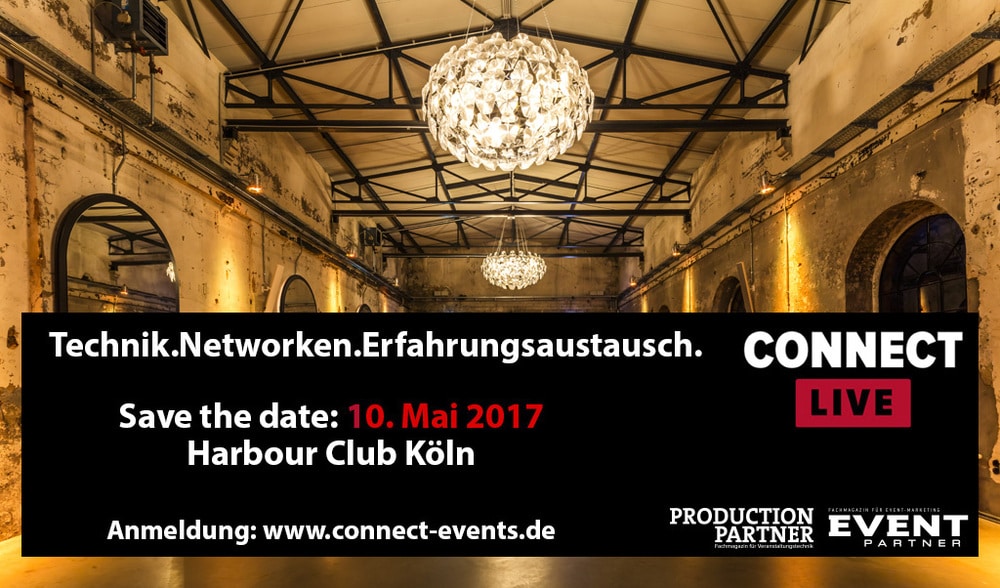 Am 10. Mai veranstalten EVENT PARTNER und PRODUCTION PARTNER im Harbour Club, Köln, erstmalig eine neuartige Event-Reihe, Connect 2017. Hier können Sie mit Kollegen und Spezialisten aus der Veranstaltungsbranche networken, mitdiskutieren, mit Herstellern ins Gespräch kommen und ausgewählte Produkte direkt ausprobieren.