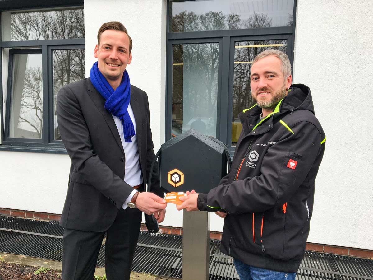 Tim Althof (l.) bei der Übergabe der Ladekarten (Bild: H.AND-Group)
