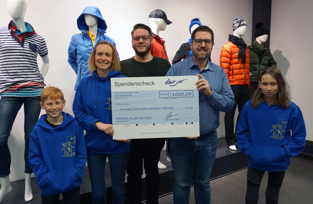 Jedes Jahr stellt die Weihnachtszeit viele Unternehmen vor die gleiche Frage: Wie kann man als Firma schnell und effektiv etwas Gutes tun? Bei dem bekannten Textilhersteller aus Albstadt ist das Engagement seit vielen Jahren Teamwork. So kam auch in 2018 wieder eine stolze Summe von 450 Euro rein aus Mitarbeiterspenden zusammen, was die Geschäftsleitung auf 1.000 Euro aufrundete. Dieses Jahr ging der Scheck an das evangelische Ferienwaldheim in Ebingen. Die Kinder können sich nun u.a. über einen neuen Backofen freuen. Daiber wünscht viel Spaß beim Kuchen backen!