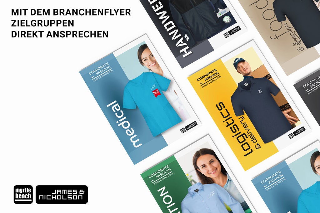 Die Gustav Daiber GmbH stellt ihren Händler:innen gedruckte Branchenflyer zur Verfügung, die jeweils Produktempfehlungen zur Corporate Fashion der Marken James & Nicholson und myrtle beach für unterschiedliche Anwendungsbereiche enthalten. Die Branchenflyer sollen Händler:innen dabei unterstützen, Kund:innen aus unterschiedlichen Branchen die geeigneten Produkte anzubieten sowie für sich neue Kundengruppen zu erschließen und gezielt anzusprechen.