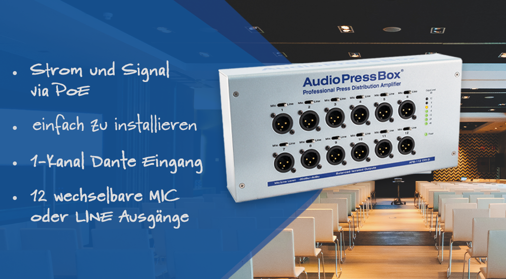 Der Dante-Markt weist noch immer Produktlücken auf, einige wurden im Laufe der Jahre mit interessanten Produkten gefüllt: Im Jahr 2017 präsentierte AudioPressBox auf der ISE Amsterdam seine beiden Dante-fähigen Presseboxen. Einer dieser Lückenfüller war die APB-112 OW-D.