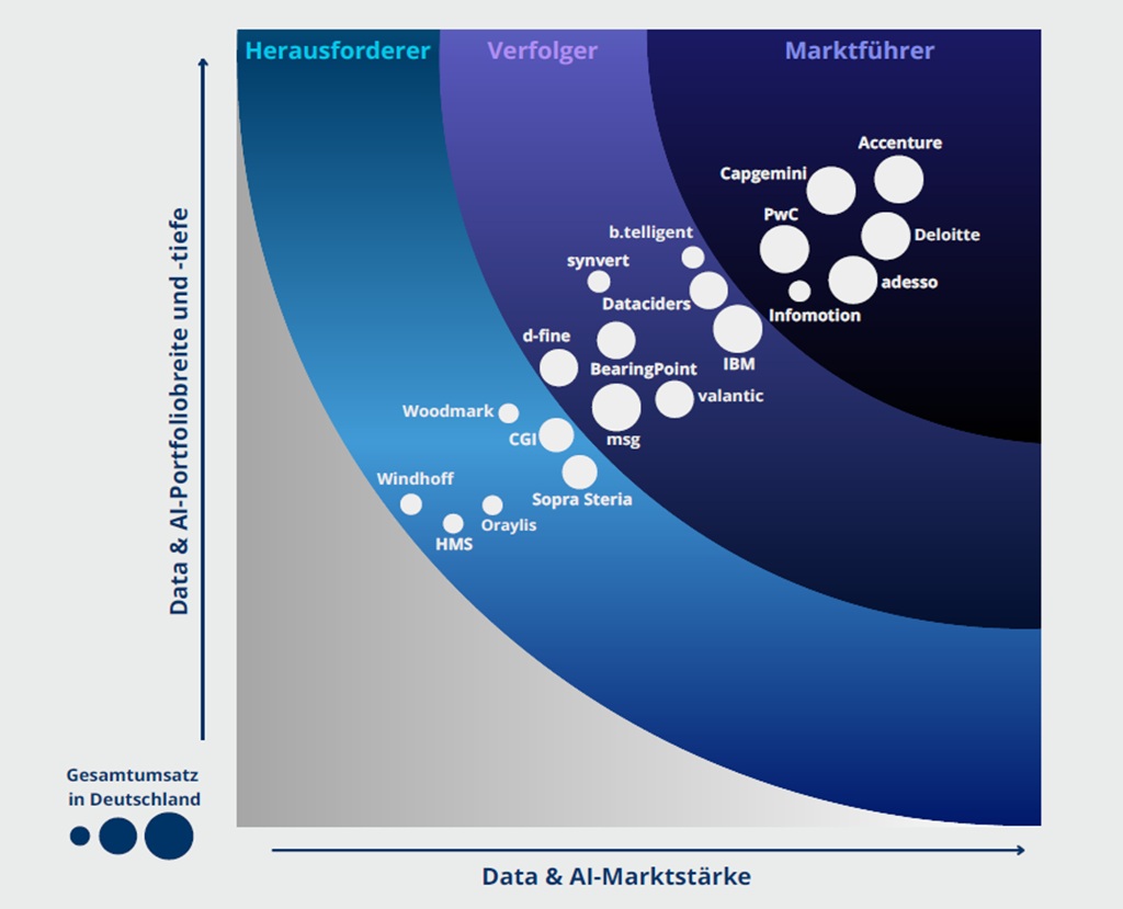 Als führende Anbieter von Data & AI Services identifiziert Lünendonk Accenture, Deloitte, Capgemini, PwC, adesso und Infomotion. Sie kombinieren ein breites Portfolio mit hoher Consulting- und Technologieexpertise sowie ausgeprägter Marktwahrnehmung. Im Verfolgerfeld sieht die Studie unter anderem b.telligent, Dataciders, synvert, IBM, d-fine, valantic, BearingPoint und msg. Zu den Herausforderern zählen CGI, Sopra Steria, Woodmark, Oraylis, Windhoff und HMS.