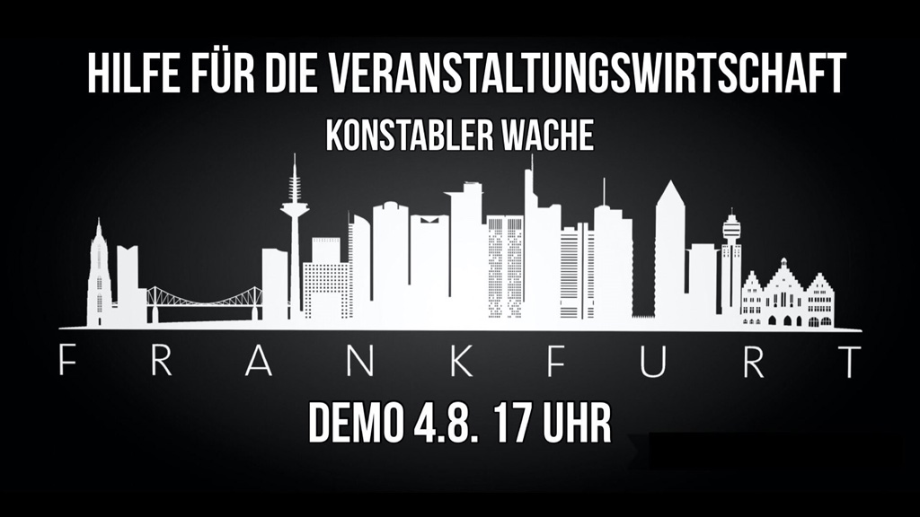 Für den 4. August 2020 ist in Frankfurt a. M. eine Demonstration für die Belange der Veranstaltungsbranche während der Corona-Pandemie geplant. Gleichzeitig will man über den Hashtag #wirfüreuch auf die Lage aufmerksam machen. Die Demonstration startet um 17 Uhr an der Konstabler Wache.