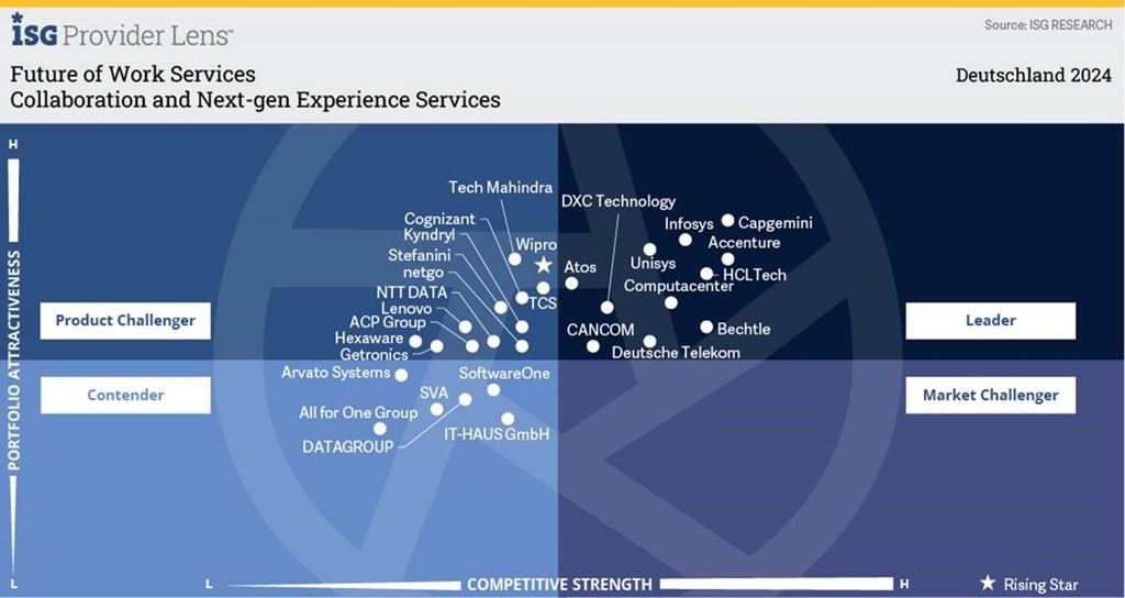 Vor diesem Hintergrund ergeben sich Marktchancen insbesondere für solche Dienstleister, die Kundenunternehmen bei der Transformation der Mitarbeitererfahrung sowohl durch strategische Planung, Change Management und Beratung als auch durch ein passendes Angebot an Managed Services unterstützen. Die Studie fasst entsprechend aufgestellte Anbieter im Marktsegment der „Collaboration & Next-Gen Experience Services“ (Bild) zusammen.
