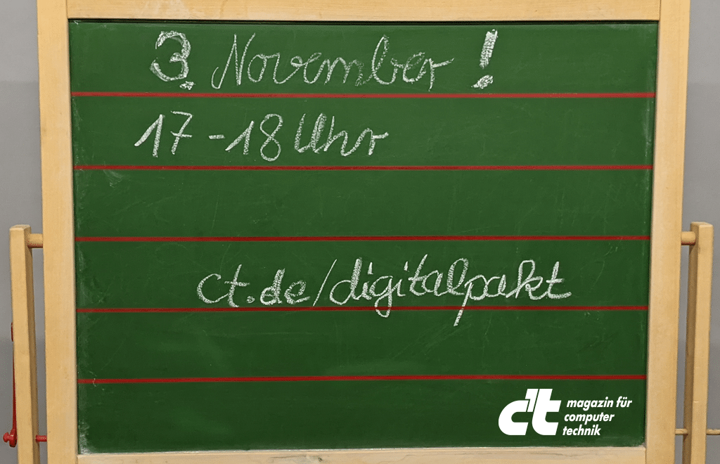 Der „Digitalpakt Schule“ soll Schulen mit frischer Technik ausstatten, doch wegen zu viel Bürokratie gestaltet sich das als zäher Prozess: Von den Milliarden, die der Bund zur Verfügung stellt, waren am 30. Juni 2021 erst 189 Millionen Euro ausgegeben und abgerechnet Damit Verantwortliche in Schulen in Sachen Vernetzung, WLAN und Beamer, Displays, PCs und Tablets besser argumentieren und entscheiden können, lädt die c’t-Redaktion am 3. November zwischen 17 und 18 Uhr zu einem kostenlosen Frage-Antwort-Livestream ein.