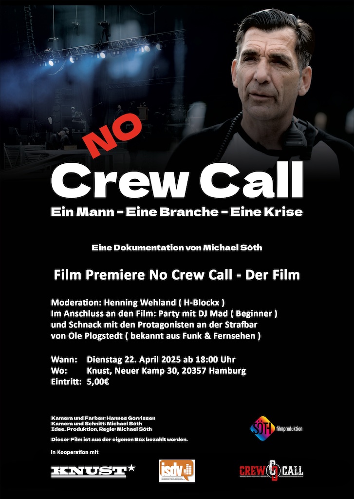 Am 22. April 2025 präsentiert das Knust in Hamburg die Premiere der Dokumentation “No Crew Call – Ein Mann – Eine Branche – Eine Krise”. Der Film des Kieler Filmemachers Michael Söth beleuchtet die Auswirkungen der COVID-19-Pandemie auf die Veranstaltungsbranche anhand des Porträts von Lars Vegas Ide, einem erfahrenen Tournee- und Produktionsleiter aus Hamburg.