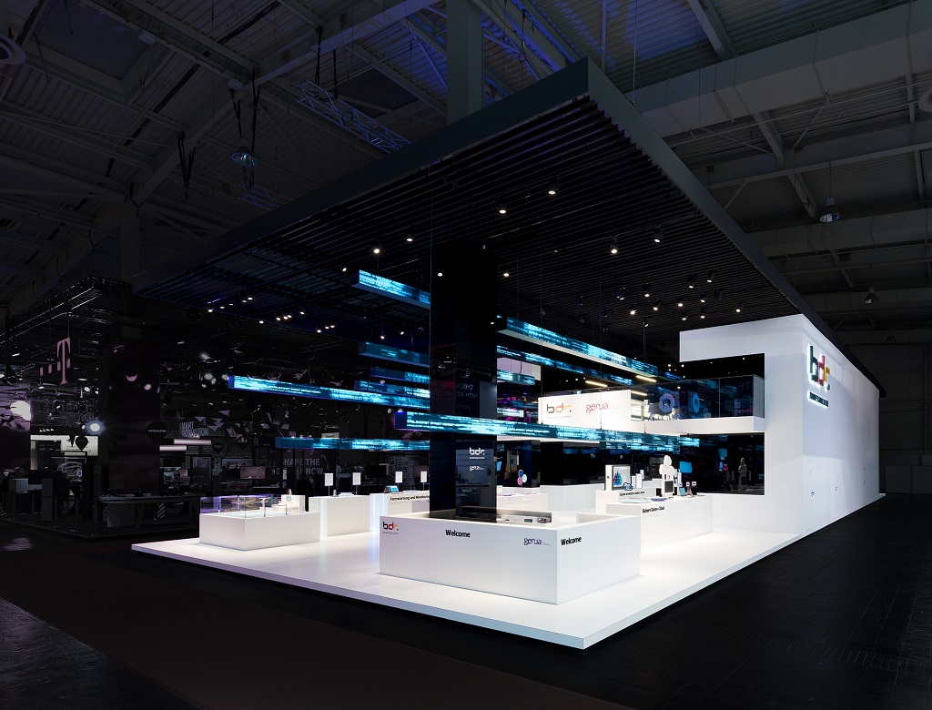 Begründung der Jury: „Durch das weiße, formal klare Design des auf zwei Ebenen gestalteten Messestands richtet sich die Aufmerksamkeit auf die Exponate und die optisch eindrucksvoll präsentierten Inhalte auf den von der Decke gehängten langen LED-Objekten. Eine faszinierende Installation, die bereits von weitem sichtbar ist und Interesse weckt.“
