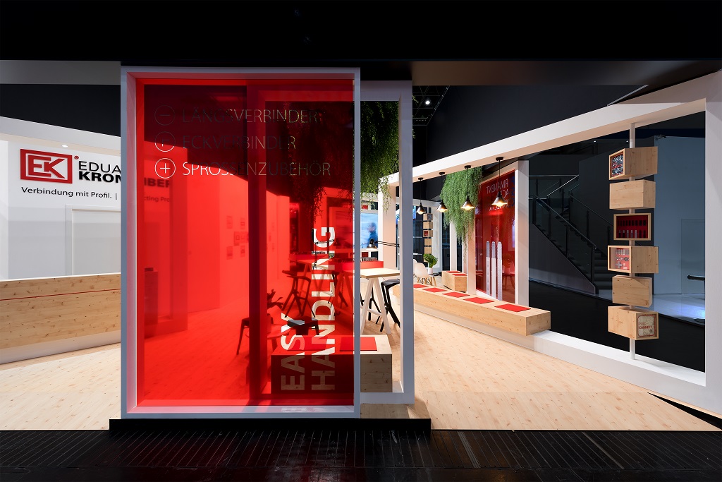 Begründung der Jury: Das Standkonzept übersetzt Fenster verschiedener Größe und Beschaffenheit in gestalterische Elemente unterschiedlicher Funktion und schafft damit eine besondere Identität und Atmosphäre.