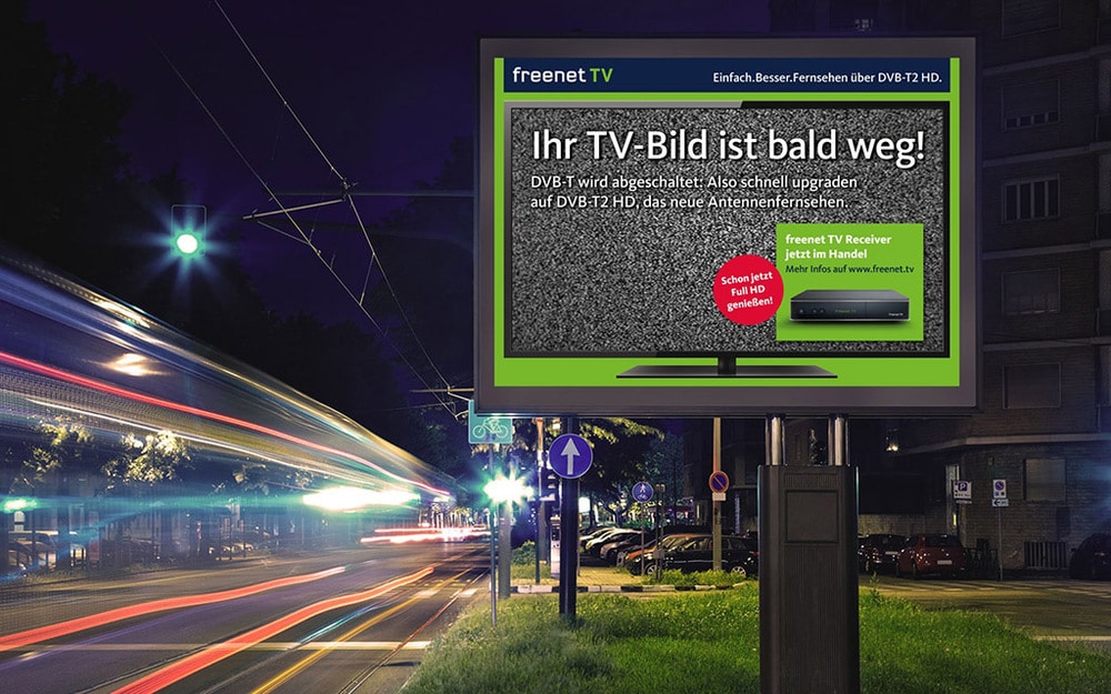 DVB-T wird abgeschaltet – für das „beste Fernsehen aller Zeiten“: Mit dieser Botschaft startet die crossmediale Kampagne für Freenet TV ab sofort in die entscheidende Runde. Im Mittelpunkt der zahlreichen Kommunikationsmaßnahmen via TV, Print, Radio, Online, Social Media, Out-of-Home sowie am Point-of-Sale stehen die Vorteile und die Content-Vielfalt des günstigsten HD-Fernsehangebots, das es auf dem deutschen Markt gibt.