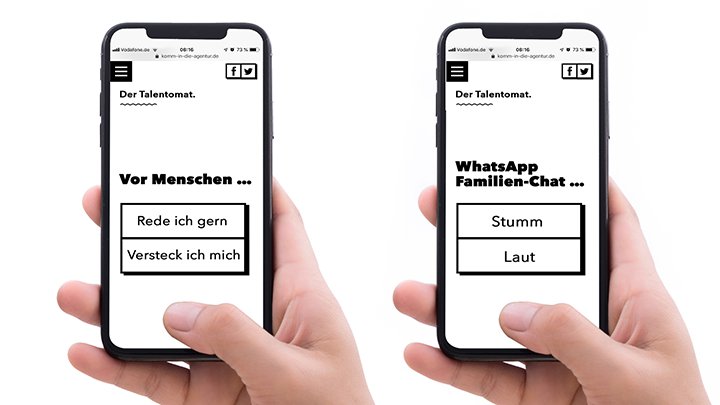 Ab dem 30.10.2019 ist die Kampagnen-Fortsetzung „live“ und soll wieder junge Talente für den Karriereweg in Agenturen begeistern. Die neue Kampagne wird unter dem Motto „Lebe Dein Talent“ an den Start gehen und primär digital ausgerichtet sein. Den Startpunkt bilden Social Clips, in denen spielerisch die vielfältigen Talente der Zielgruppe inszeniert und mit möglichen Agenturberufen verknüpft werden. Das eigene Talent und Jobprofil lässt sich dann mit einem Klick, mit Hilfe des „Talentomats“ testen. Dieser ist das Herzstück des Content Hubs www.komm-in-die-agentur.de und bietet die Möglichkeit, spielerisch das individuelle Berufsprofil zu ermitteln und sich einen Überblick über konkrete Jobangebote aus der Agenturszene zu verschaffen. Wer es genauer wissen will, hat darüber hinaus die Möglichkeit, sich via Live-Chat mit echten Agenturmitarbeitern auszutauschen und so ein Bild von der Arbeit in Agenturen zu bekommen.