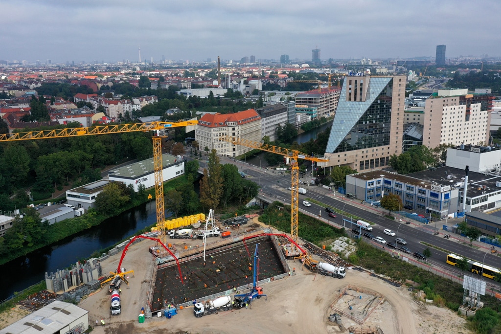 Fast alle Betonlieferanten Berlins wurden zusätzlich zu der eigenen Betonmischanlage auf dem Gelände, die im Regelbetrieb alle Betonarbeiten für das Bauwerk abdeckt, für das Projekt beauftragt. Somit kann das Fundament für den Estrel Tower, der mit 176 Meter Berlins höchstes nicht-technisches Gebäude wird, gelegt werden.