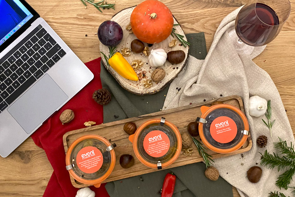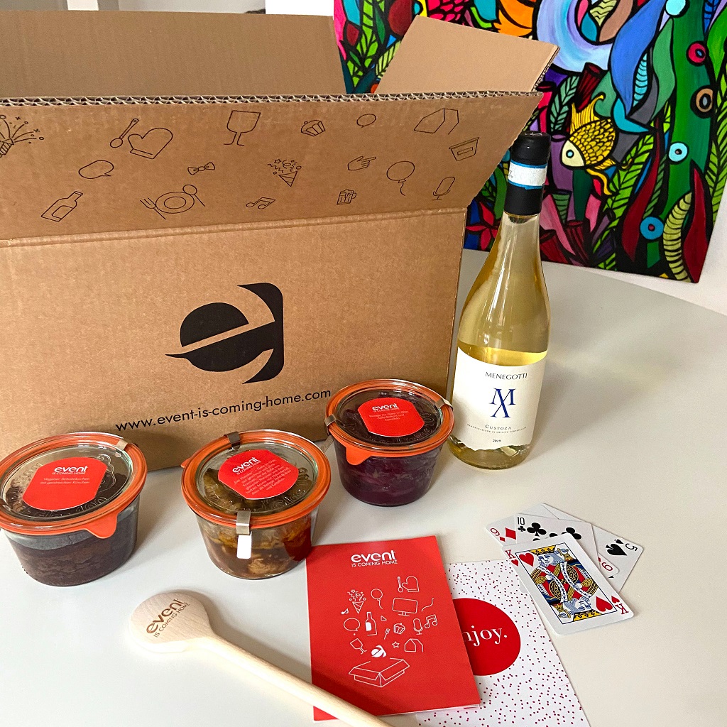 Bei der Online-Location setzt Event is coming home auf die Online-Live-Event-Plattform hopin und deren vielfältige Funktionen. Innerhalb des Entertainment-Moduls können Künstler, wie zum Beispiel Musiker und Zauberer, hinzugebucht werden. Die Eventboxen, die zu allen Teilnehmern nach Hause versendet werden, konfigurieren die Organisatoren mit den gewünschten Inhalten: Die hochwertigen Speisen sind frisch zubereitet und werden in Weck-Gläsern vakuumiert verpackt, sodass sie frisch und haltbar bleiben. Passend dazu steht eine große Auswahl an Getränken zur Verfügung. Eine dem Eventformat entsprechende Dekoration gehört ebenso zur Eventbox wie die individuell gebrandeten Give-aways. Somit spiegelt das Angebot von Event is coming home viele Facetten einer physischen Veranstaltung wider und transportiert Emotionen in den virtuellen Raum.