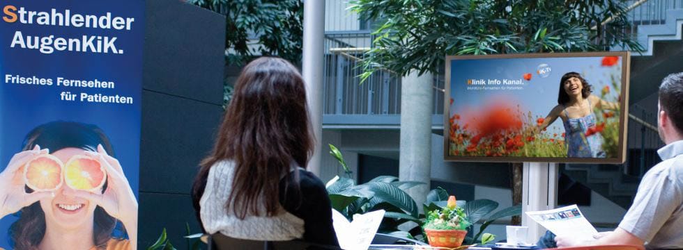 Die ersten Eyevis-Monitore sind bereits erfolgreich bei mehreren Foyers und Cafeterias der über 650 von KIK-betreuten Kliniken im Einsatz.