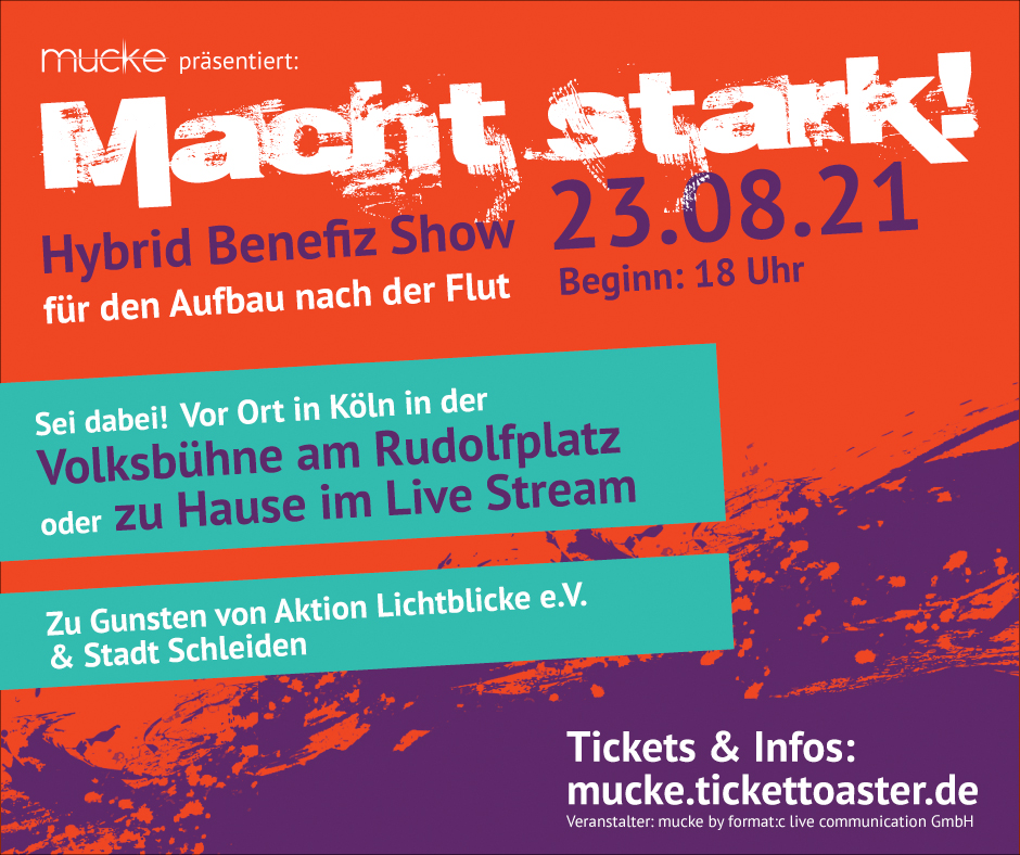 Mit großzügiger Unterstützung von Geschäftspartnern, Sponsoren und Künstlern will die Agentur schon am nächsten Montag, dem 23. August 2021, mit einer Hybrid Benefiz Show Spendengelder sammeln. Der Ticketerlös geht an die Aktion Lichtblicke e.V. und die Stadt Schleiden in der Eifel. Schleidens Bürgermeister Ingo Pfennings wird persönlich in der Show zu Gast sein und von den Folgen des Unwetters für seine Stadt berichten.