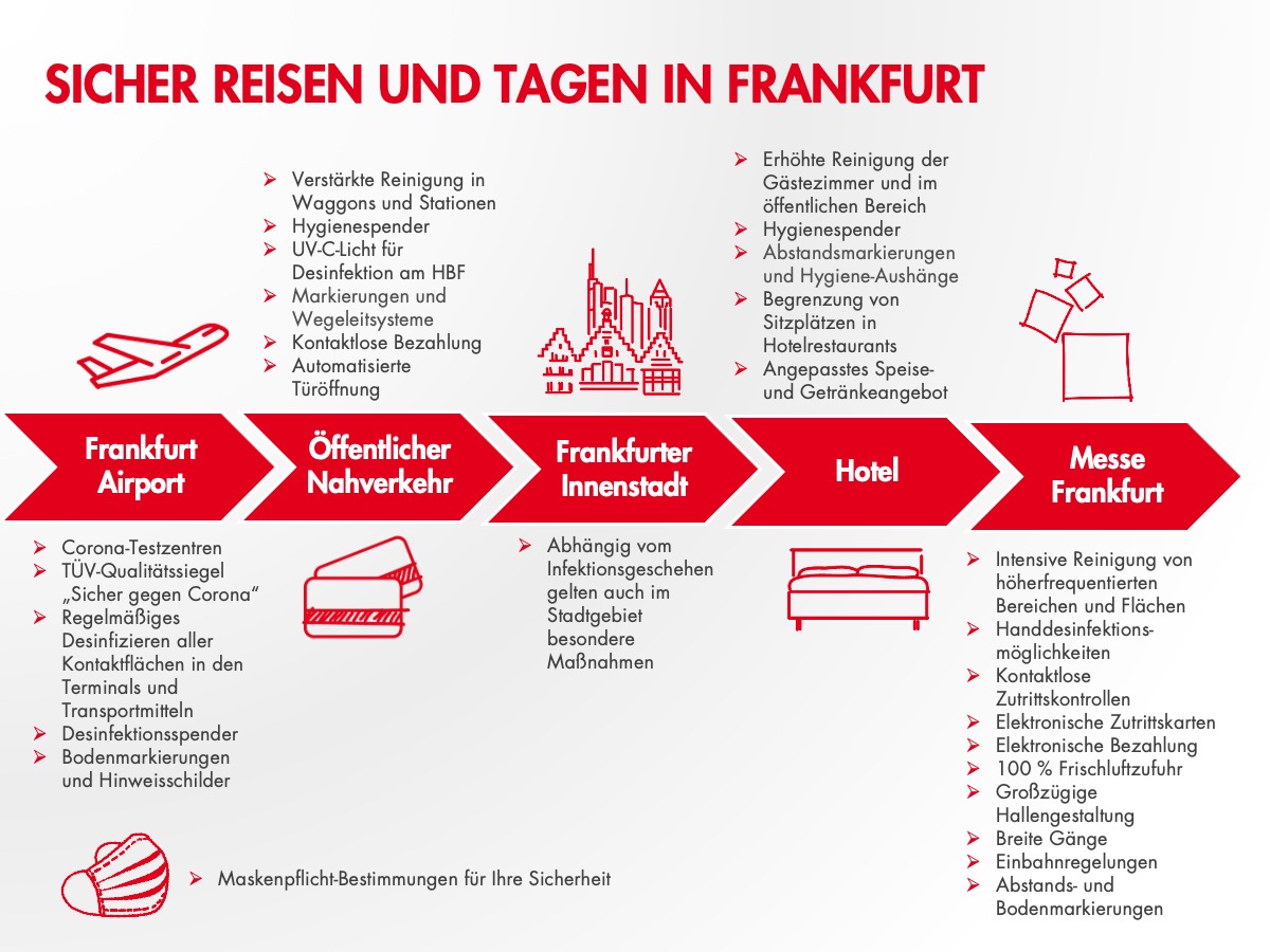 In den Frankfurter Hotels sind vielfältige Corona-Schutzmaßnahmen umgesetzt worden, die neben einer intensiven Reinigung aller öffentlichen und privaten Bereiche auch ein angepasstes Speisen- und Getränkeangebot beinhalten. Gleiches gilt für die Frankfurter Locations, insbesondere die Messe Frankfurt. Belüftungsanlagen ermöglichen hier bis zu 100% Frischluftzufuhr in allen Hallen. Darüber hinaus werden durch kontaktlose Zutrittskontrollen und elektronische Zutrittskarten direkte Kontakte reduziert.