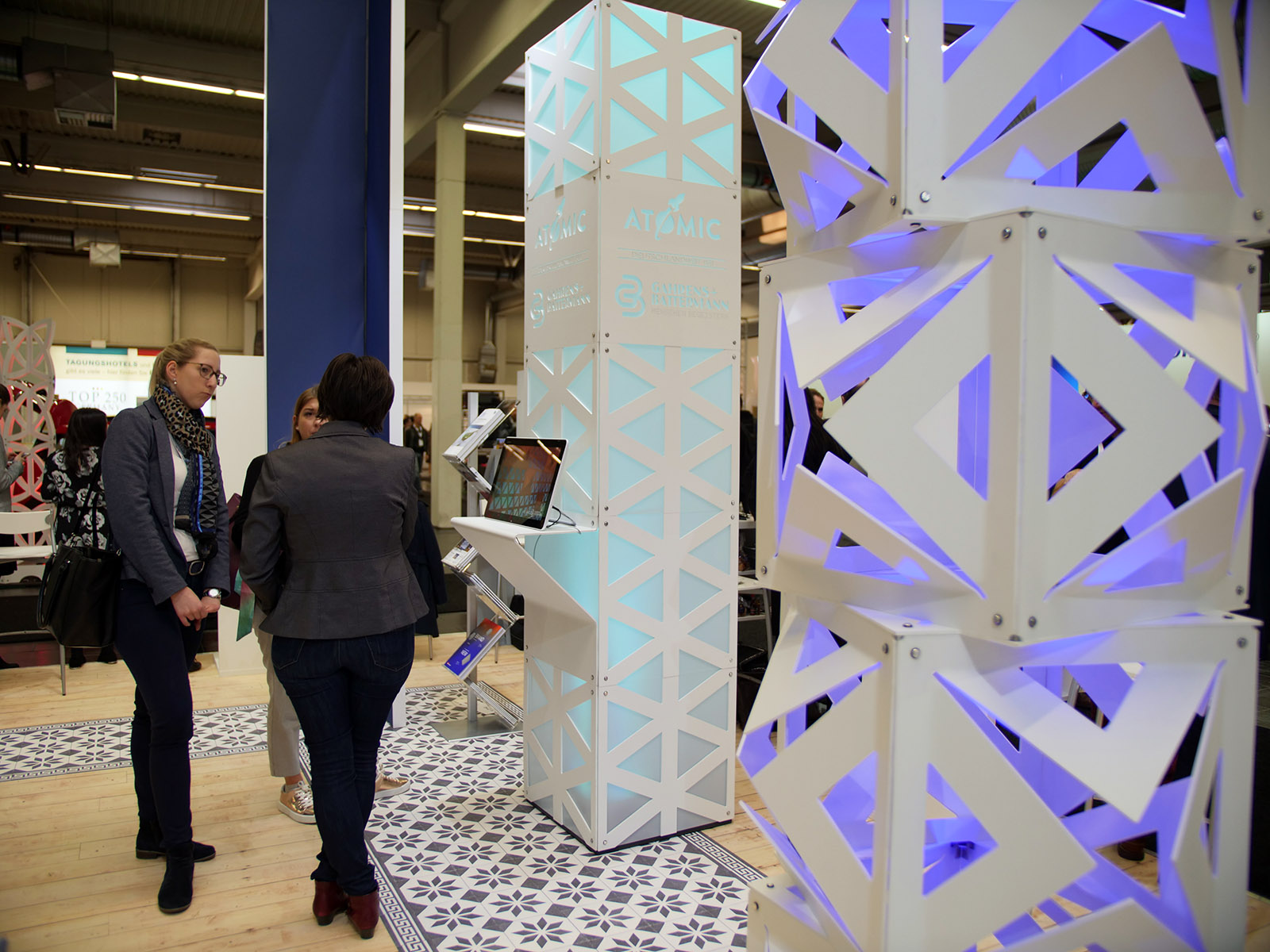 Neben dem Messestand der dfv Mediengruppe konnten die Messebesucher die patentierten Sitzhocker, die sogenannten FlatCubes, und das eigenentwickelte Booking-Tool „Isi“, das für „Instant Swoofle Item“ steht, der Berliner Möbelmanufaktur Swoofle kennenlernen. Passend zum Thema Designhocker erstrahlte der Messestand im kreativen Atomic-Design. Die FastWall als luftiger Raumtrenner sowie die freistehende SuperWall inklusive der sondergefertigten Logopanels sorgten für einen Blickfang.