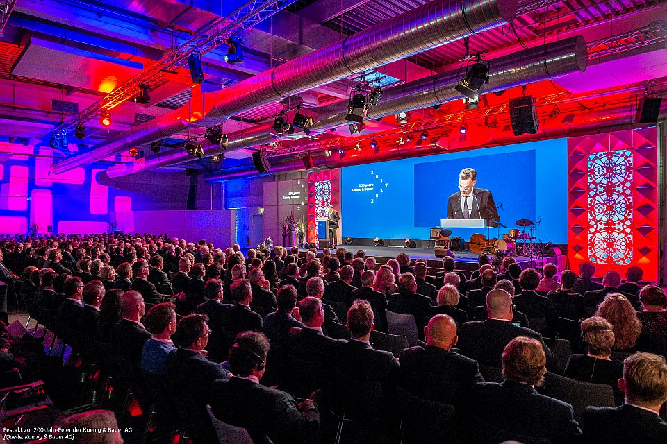 Den zahlreichen Jubiläumsgästen und Referenten aus dem In- und Ausland, unter ihnen auch Bundespräsident a. D. Horst Köhler als Hauptredner, bot das Unternehmen ein buntes Programm. Beim Festakt im VCC entführte eine Multimediashow die Besucher auf eine Zeitreise durch zwei Jahrhunderte und eine eigens für die Veranstaltung zusammengestellte Jazz-Performance sorgte für musikalische Highlights. Für die Übertragung der Inhalte und Showacts installierte Gahrens + Battermann auf der Bühne eine 10 x 3,5 Meter große LED-Wand. Zudem wurde ein modulares Setbau-System von ATOMIC Rental Solutions neben der LED-Wand als Eyecatcher auch für Koenig & Bauer im Bühnenbereich eingesetzt. Individuell zusammengestellte Designpanels wurden als Seitenabschluss der Bühnengestaltung gewählt und suggerierten den Gästen ein Tiefenerlebnis für das Auge. Um das Gesamtpaket zu komplettieren, war das G+B-Team ebenfalls für die gesamte Ton- und Dolmetschertechnik, Kamera- und Regietechnik, als auch für die anspruchsvolle Lichtinszenierung zuständig.