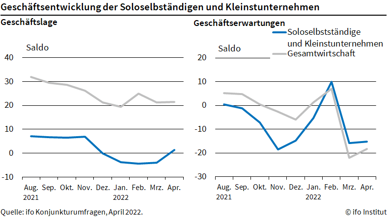 Das Geschäftsklima für Kleinstunternehmen und Soloselbständige hat sich geringfügig erholt. Das sind die Ergebnisse des aktuellen Indexes für dieses Segment („Jimdo-ifo-Geschäftsklimaindex“). Er stieg im April auf minus 7,2 Punkte (nicht saisonbereinigt), nach minus 10,0 im März. „Der Ausblick auf die kommenden Monate ist jedoch weiterhin von Pessimismus geprägt“, sagt Klaus Wohlrabe, Leiter der ifo-Umfragen. „Viele kleine Unternehmen machen sich weiterhin Sorgen um ihre Existenz.“