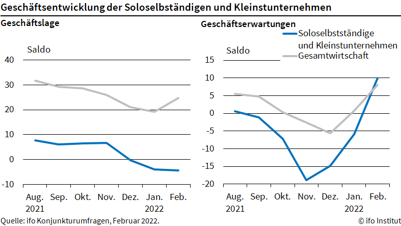 Seit August 2021 berechnet das ifo Institut den Jimdo-ifo-Geschäftsklimaindex für Soloselbständige und Kleinstunternehmen (weniger als 9 Mitarbeiter). Wie im Gesamtindex sind alle Sektoren abgebildet. Der Schwerpunkt liegt jedoch auf dem Dienstleistungssektor. Die Gewinnung der neuen Teilnehmer erfolgt in Kooperation mit Jimdo, einem Anbieter von Online-Tools speziell für Soloselbstständige und kleine Unternehmen.