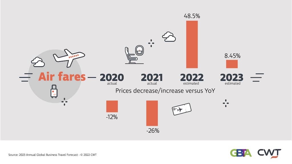 Für die verbleibenden Monate des Jahres 2022 und für das Jahr 2023 wird laut des Global Business Travel Forecast, der von CWT und der Global Business Travel Association (GBTA) veröffentlicht worden ist, ein weiterer Anstieg der Reisepreise erwartet.
