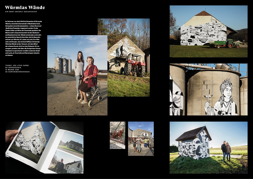 Abschlussarbeit des Jahres ist der Case Würmlas Wände von Katharina C. Herzog und David Leitner, die an der Universität für angewandte Kunst Wien studieren. Sie initiierten ein Kunstprojekt in der Gemeinde Würmla, einem kleinen Ort 60 Kilometer entfernt von Wien: Würmlas Wände – urbane Kunst auf ländlichen Fassaden. Insgesamt wurden 13 alte Stadel, Keller und Silos in zehn Ortschaften der Gemeinde gestaltet. Die Motive entstanden in Zusammenarbeit mit den Besitzer:innen der Wände und erzählen persönliche Geschichten der Dorfbewohner:innen von Würmla, von ihren Wünschen und Sorgen, vom Leben auf dem Land. An der Schnittstelle zwischen urbaner Kunst und ruraler Architektur entstanden Begegnungsflächen, die durch einen Wanderweg miteinander verbunden wurden. Ein Buch informiert ergänzend über die Geschichten hinter den Wänden. Der Grand Prix Case Würmlas Wände lässt Stadt- und Landbewohner:innen in den Dialog treten und macht Vorurteile und Stereotypen sichtbar.