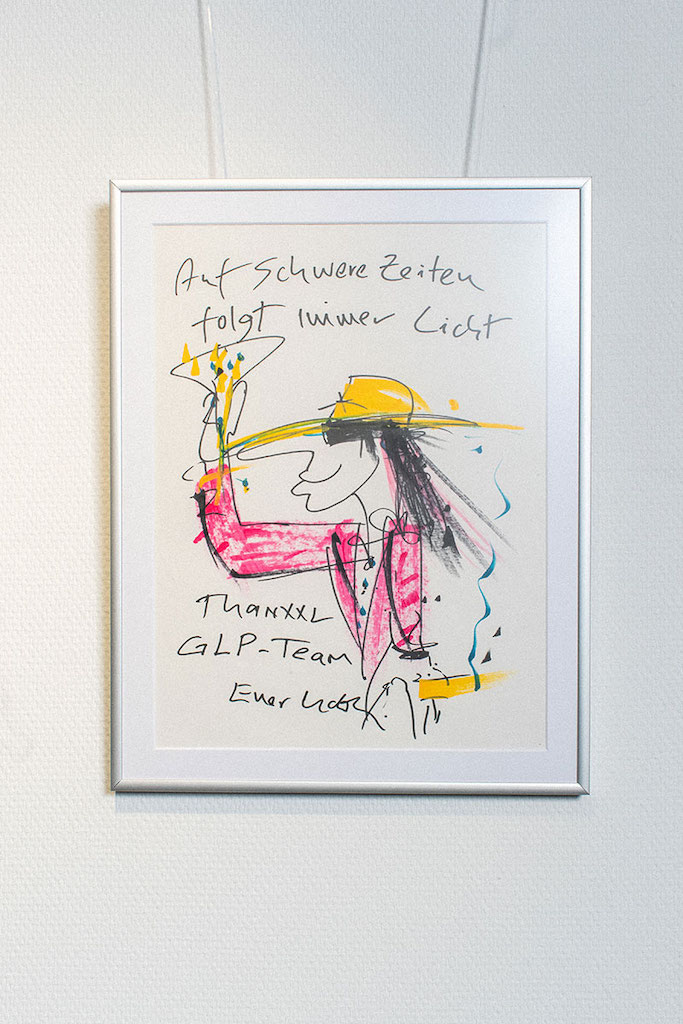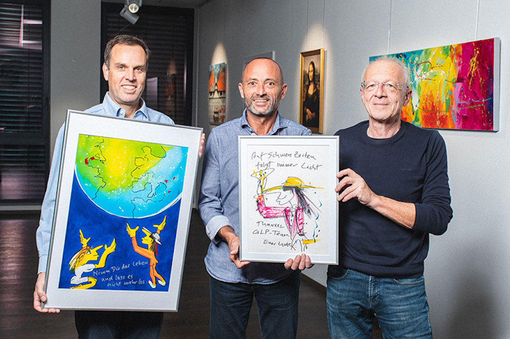 Anlässlich der Eröffnung des neuen Installations-Showrooms übergab Lichtdesigner Günter Jäckle ein Kunstwerk von Udo Lindenberg an Udo Künzler und Oliver Schwendke von GLP. Als Überraschung hatte er noch eine Zeichnung des Künstlers mit spezieller Widmung im Gepäck, die eine Brücke zwischen dem Lindenberg-Song „Schwere Zeiten“ und GLP schlägt.