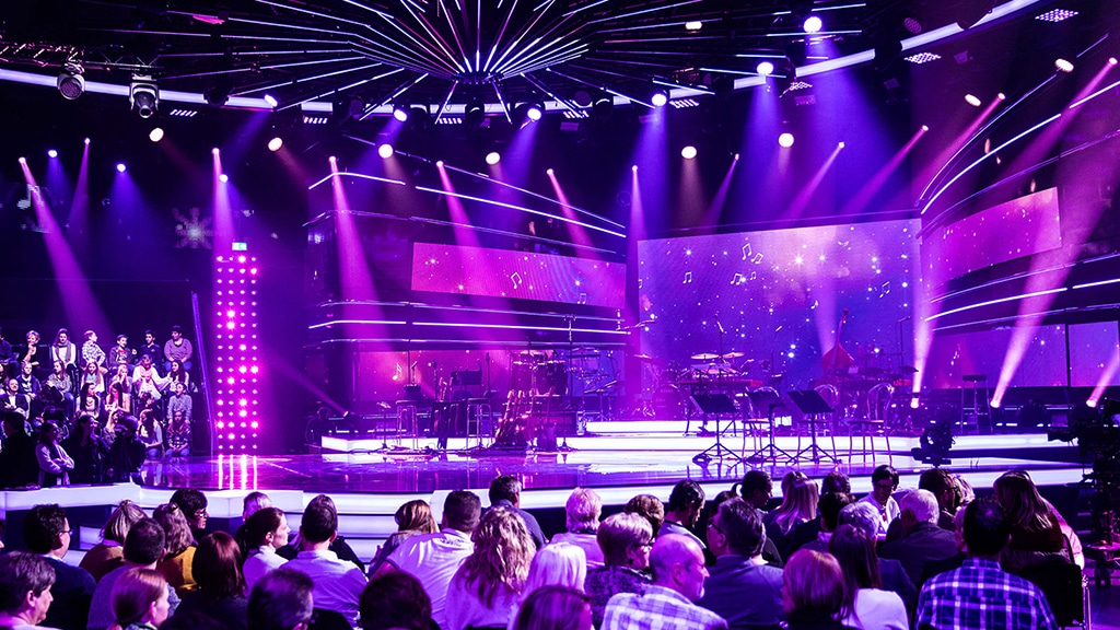 Für die Samstagabend TV-Show «Ich schänke dir es Lied!» wurden die X4 atoms gleich in verschiedenen Arrangements eingesetzt: als große Matrix zwischen den Zuschauerrängen und in kreisrunden Traversenkonstruktionen über der Bühne beim großen Finale.