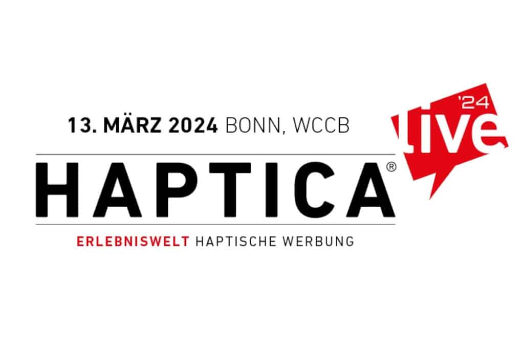 Am 13. März 2024 findet im World Conference Center Bonn die Haptica live ’24 statt. Die „Erlebniswelt Haptische Werbung“ biete Köpfen aus Werbung, Marketing und Einkauf ein Programm rund um Werbeartikel und ihren Einsatz.