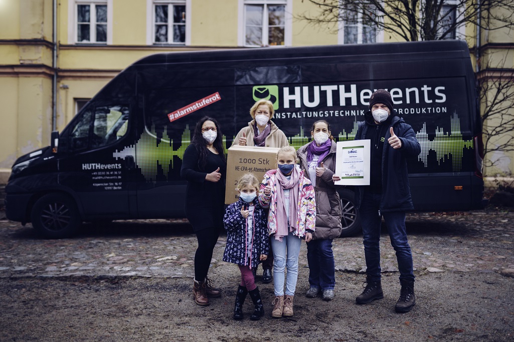 1.000 FFP2-Masken gingen an Food4Homeless, eine private Initiative, für die Huths Mitarbeiter Christian Eggers (Tontechniker) ehrenamtlich warmes Essen an Obdachlose im Berliner Stadtgebiet ausliefert. Knut Borowski, Gründer der Initiative Food4Homeless sagt „Unser Food Truck ist normalerweise bei größeren Veranstaltungen im Einsatz, aber die gibt es ja nicht mehr. Gemeinsam mit Kollegen aus der Veranstaltungsbranche haben wir das Projekt im Dezember ins Leben gerufen. Nun sind wir 28 ehrenamtliche Köche und Essensausfahrer – fast alle aus der Eventbranche. Ich freue mich sehr, dass ich den Helfern und Obdachlosen jetzt hochwertige Atemschutzmasken anbieten kann.“
