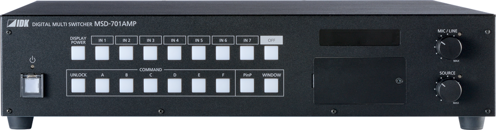 IDK präsentiert das neue Modell aus der MSD-Serie digitaler Multi-Switcher. Der MSD-701AMP ist ein 7-auf-1 Presentation-Switcher mit HDBaseT-Konnektivität für digitale und analoge AV-Signale. Neben IDK-exklusiven Features wie Anti-Snow und Connection Reset zur automatischen Beseitigung von Problemen beim HDMI-Handshake bietet das Gerät Scaling in FullHD/WUXGA sowie einen integrierten Audio-DSP. Audiosignale können über 7 digitale und 3 analoge Eingänge eingespeist, mit einem Line- und einem Mic-Signal gemischt und über Line-Level-Schnittstellen (digital/analog) oder als verstärktes Lautsprechersignal ausgegeben werden. Die Lip-Sync-Funktion korrigiert Delays zwischen Video und Audio.