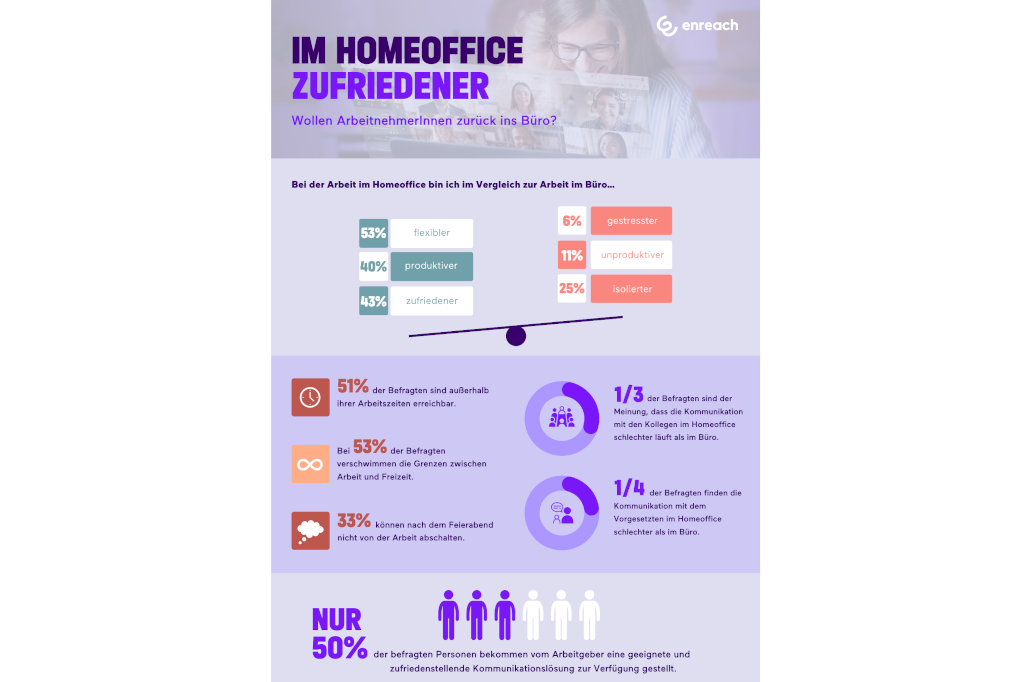 Das Ergebnis der von Enreach, europäischer Anbieter von Unified-Communications- und Cloud-Contact-Center-Lösunge, durchgeführten Umfrage besagt, dass Deutschlands Arbeitnehmer:innen im Homeoffice flexibler und zufriedener sind als bei der Arbeit im Büro. In drei Punkten gebe es jedoch noch Verbesserungsbedarf.