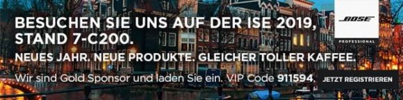 Bose stellt auf der ISE 2019 in Amsterdam die neuen ArenaMatch DeltaQ Array-Lautsprecher und ArenaMatch Utility Lautsprecher für Installationen im Freien vor. Darüber hinaus erweitert Bose Professional die ControlSpace EX Produktreihe um zwei neue Prozessoren, die für Konferenzräume optimiert sind (EX-440C und EX-12AEC), sowie einen leistungsstarken Prozessor zur digitalen Signalverarbeitung für Anwendungen mit Dante Integration (EX-1280).