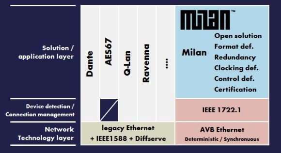 Milan ist ein auf Standards basierendes, benutzergesteuertes, deterministisches Netzwerkprotokoll für Professional Media, das sicherstellt, dass Geräte auf einem neuen Maß an Komfort, Zuverlässigkeit und Funktionalität zusammenarbeiten. Milan wurde von den Pro-Audio-Marktführern in der Avnu Alliance gegründet und wird von diesen betreut. Milan ist die erste greifbare Lösung für die deterministische, zuverlässige und zukunftssichere Bereitstellung vernetzter Medien. Milan kombiniert die technischen Vorteile des AVB-Standards mit den von Pro AV auf dem Markt definierten Geräteanforderungen sowohl auf Netzwerk- als auch auf Anwendungsebene für Media Streams, Formate, Taktung und Redundanz.