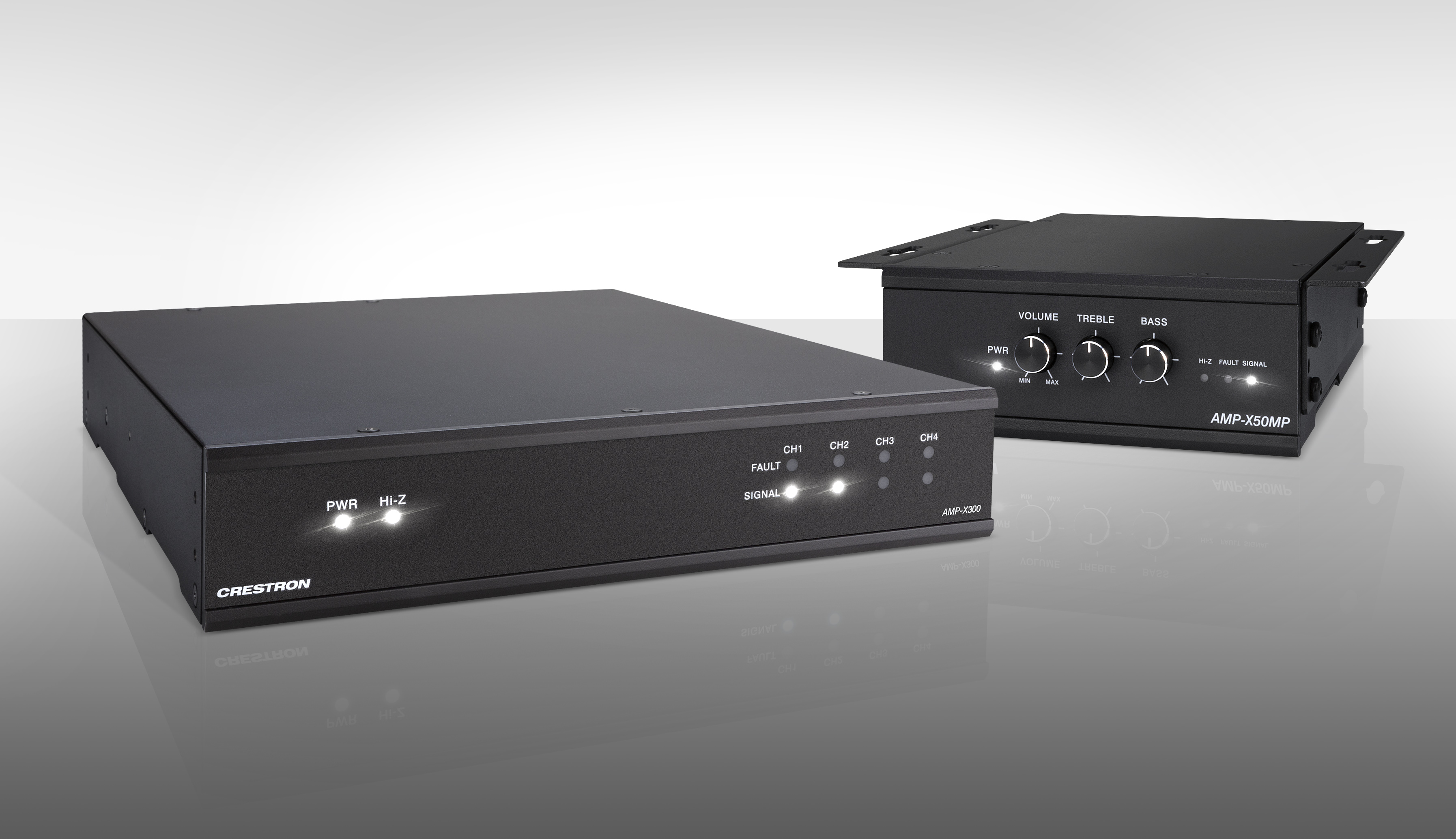 Der 4-Kanal-AMP-X300 liefert 75 W pro Kanal. Wenn mehr Leistung erforderlich ist, ist mit einer Überbrückung 150 W pro Kanal möglich. Es kann zwischen normalem 4/8-Ohm-Betrieb und 2 Kanälen mit 70/100-Voltbetrieb umgeschaltet werden. Der AMP-X50MP liefert 25 W pro Kanal bei 4/8 Ohm oder kann überbrückt werden, um 50 W für einen Kanal mit 70/100 Volt bereitzustellen.