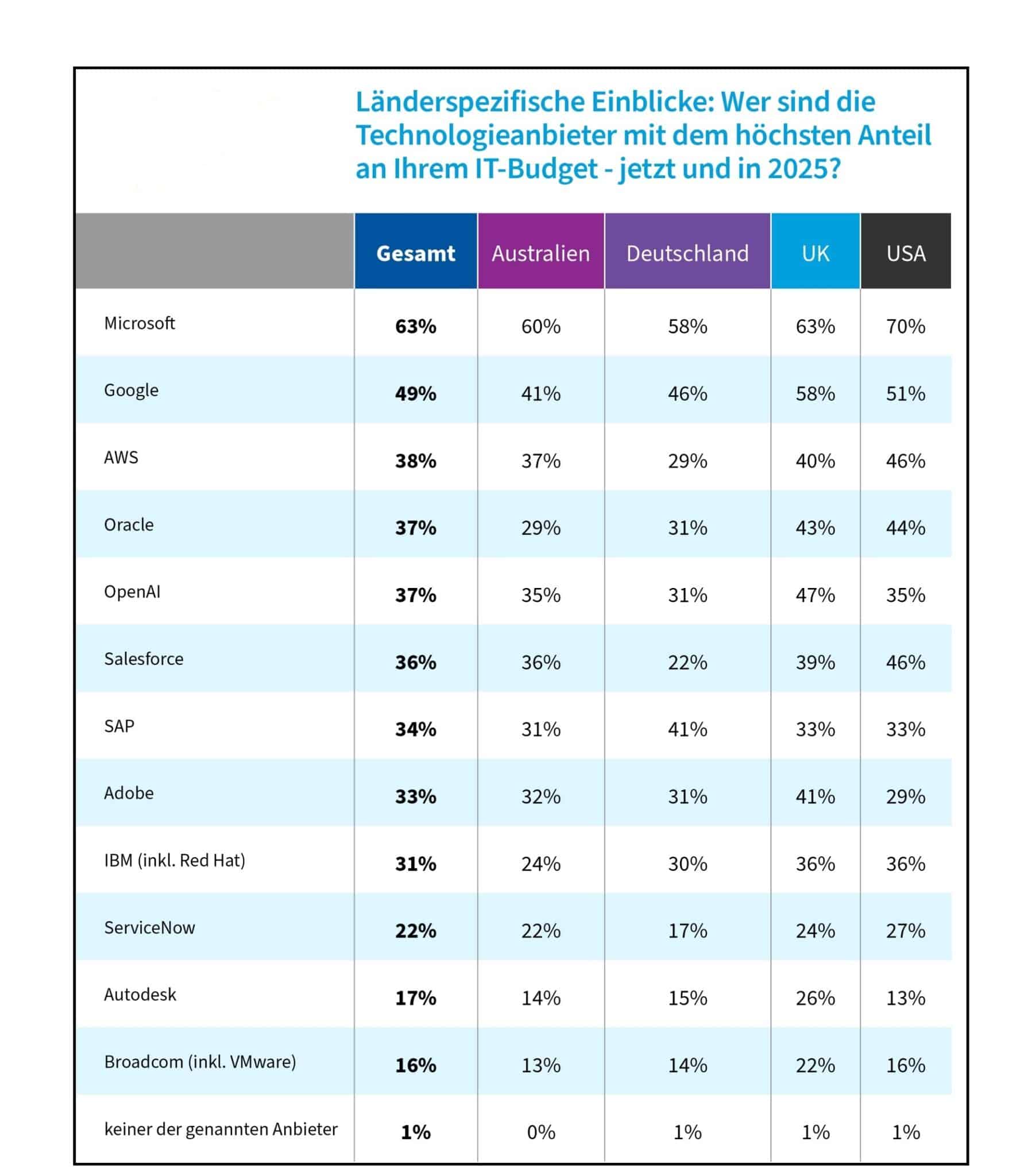 Das IT-Portfolio von Unternehmen spiegelt die KI-Wende bereits wider. Microsoft hat in den letzten Jahren energisch in den Markt investiert. Mit der Partnerschaft mit OpenAI und der Integration der Technologie in bestehende Produkte (Stichwort: Copilot) konnte der Konzern seine Position an der Spitze der KI-Branche festigen. So überrascht es kaum, dass das Unternehmen zum vierten Mal in Folge der Technologieanbieter mit dem größten Anteil am IT-Budget in Unternehmen ist (63 %).
