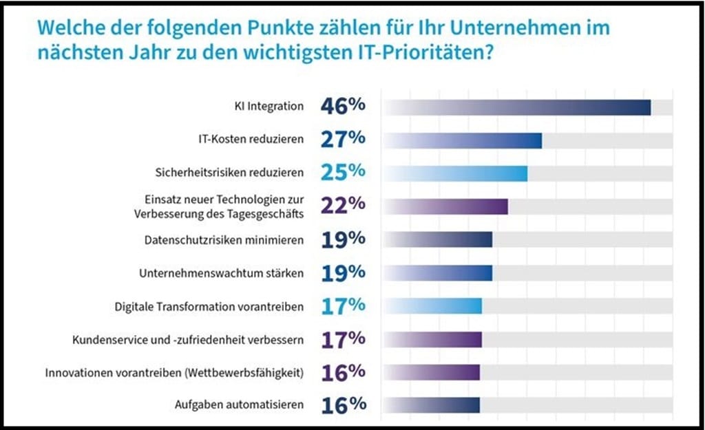 Das Thema KI beschäftigte die IT in diesem Jahr stark. Fast die Hälfte (42 %) der befragten IT-Führungskräfte geht davon aus, dass sich KI-Technologien – vorausgesetzt ihre Integration gelingt – massiv auf den Geschäftserfolg auswirken werden. Damit wird KI als vielversprechender eingeschätzt als die Beseitigung von Sicherheitsrisiken (26 %) und die Reduzierung von IT-Kosten (25 %). Darüber hinaus erwarten 74 03% der Befragten, dass der KI-Einsatz in den nächsten zwei bis drei Jahren weiter zunimmt. Für 2025 scheint der IT-Fahrplan damit klar. Nach Einschätzung von 46 % schafft es die Künstliche Intelligenz im nächsten Jahr sogar auf Platz 1 der Prioritätenliste.